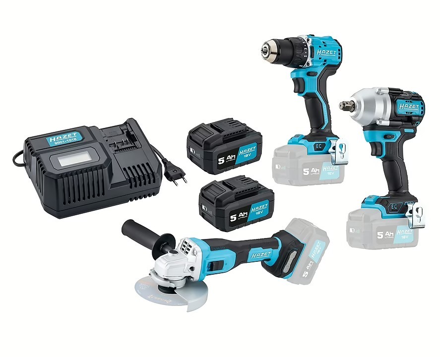 Sada aku náradia Hazet – vŕtačka, rázový uťahovák, uhlová brúska, 2x aku, nabíjačka. 5Ah akumulátory (18 V), aku vŕtačka so skľučovadlom 1,5–13 mm, rázový uťahovák s max. momentom 950 Nm, uhlová brúska s otáčkami 10.000/min.