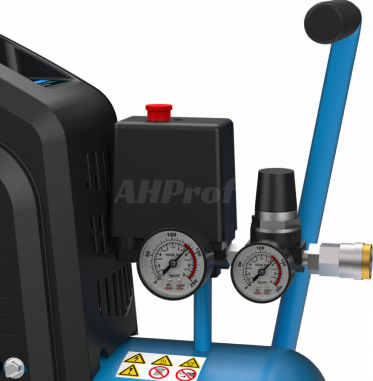 Vybavenie: 2 manometre, 1 výstup stlačeného vzduchu (kovová rýchlospojka), tlakový spínač, redukčný ventil, poistný pretlakový ventil, spätný ventil, vzduchový filter, 1,5 m sieťový kábel H05 VV-F.