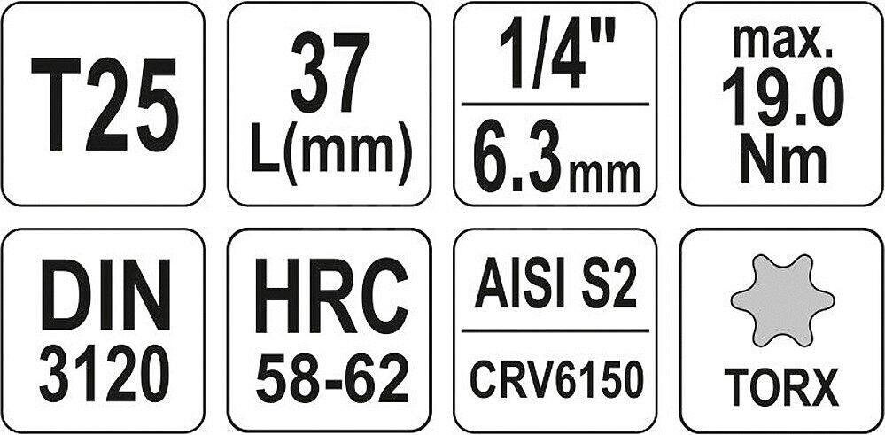 Dĺžka 37 mm, materiál CrV 6150, AISI S2. HRC 58-62, DIN 3120. Max. krútiaci moment 19 Nm.