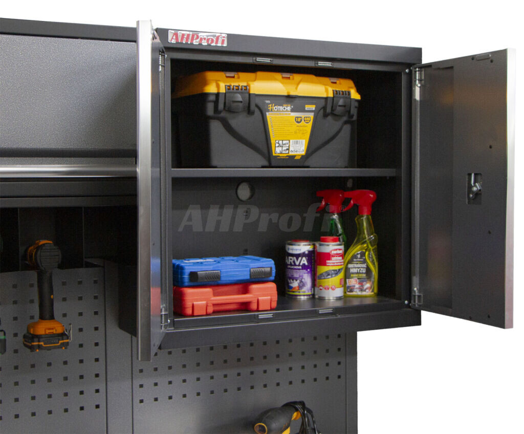 Celokovová dvojkrídlová závesná skrinka sa predáva aj v rámci kvalitného PROFI dielenského nábytku. Skrinka je vhodná do profesionálnych servisov, dielní, ale aj do garáží pre uskladnenie širokého sortimentu tovaru aj ručného náradia, na ktoré sa potom nepráši a ľahšie sa udrží prehľadne upratané na správnom mieste. Skrinka je uzamykateľná.