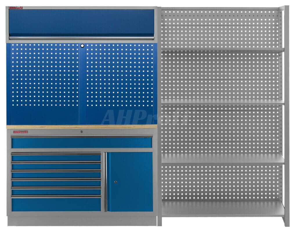 Zostava 9 ks, 2560 x 495 x 2000 mm, drevená pracovná doska, modulárna, celokovová, modrá. Široká horná výklopná skrinka. Spodné skrinky: široká so zásuvkami. Regál: široký. 2 dierované dosky s rozstupom 38 x 38 mm. Kvalitný dielenský nábytok vhodný pre profesionálne servisy aj domáce garáže a dielne.