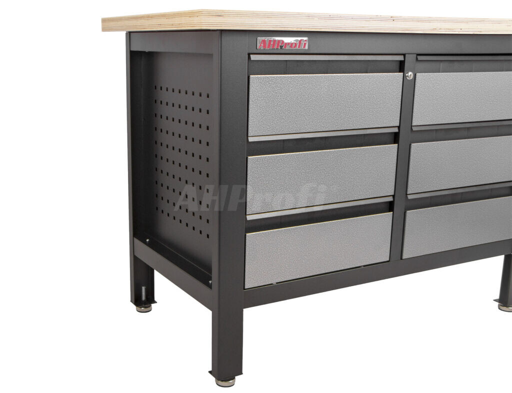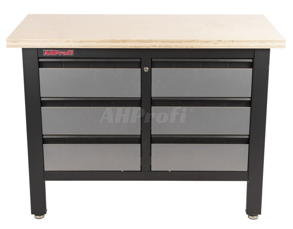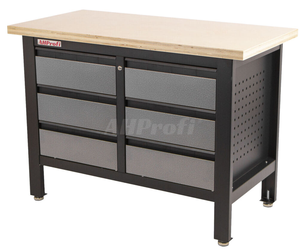 Kovový ponk o rozmeroch 1200 x 865 x 600 mm. Drevená pracovná doska, 6 šuplíkov, hmotnosť 65 kg.