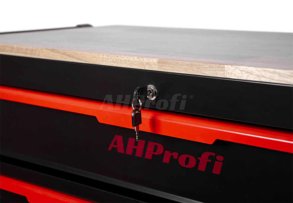 Široký dielenský vozík s drevenou pracovnou doskou, 12 zásuviek, 360 ks náradia v 11 penových výplniach, 2 bočné dierované dosky.