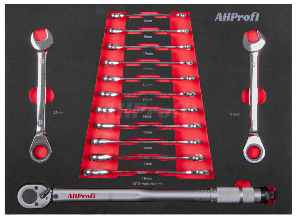 | Ráčnové kľúče: 8, 9, 10, 11, 12, 13, 14, 15, 16, 17, 19, 21, 22 mm | |