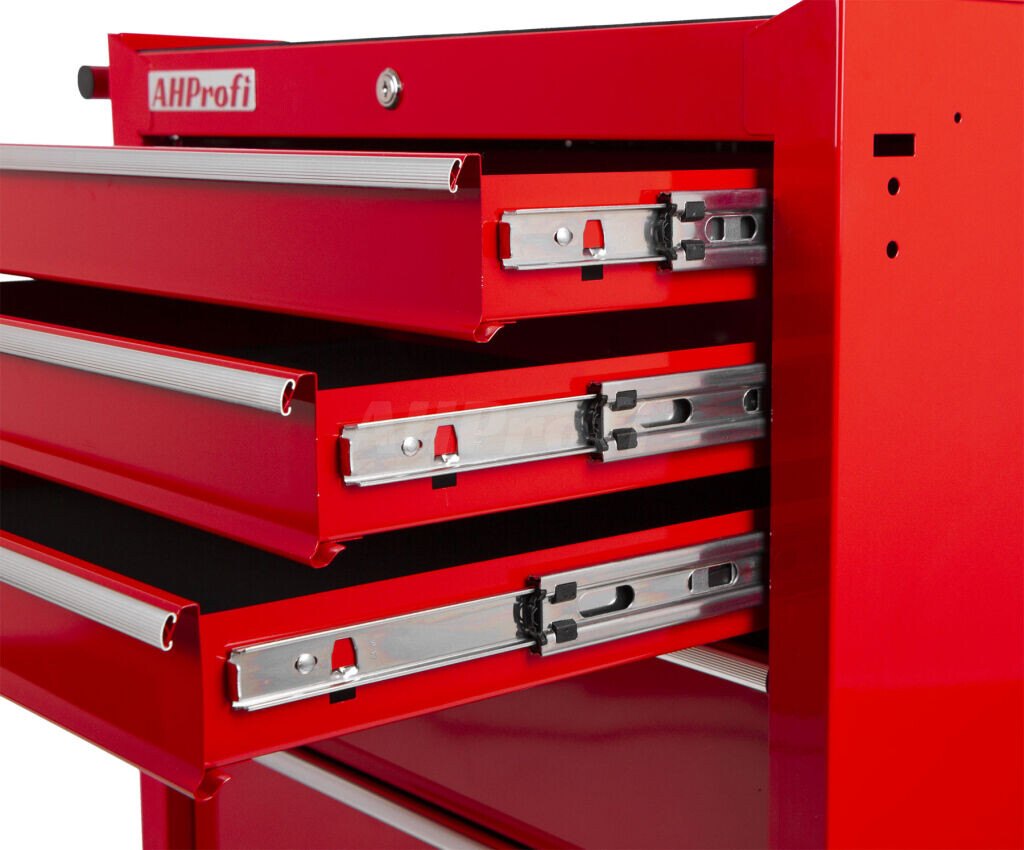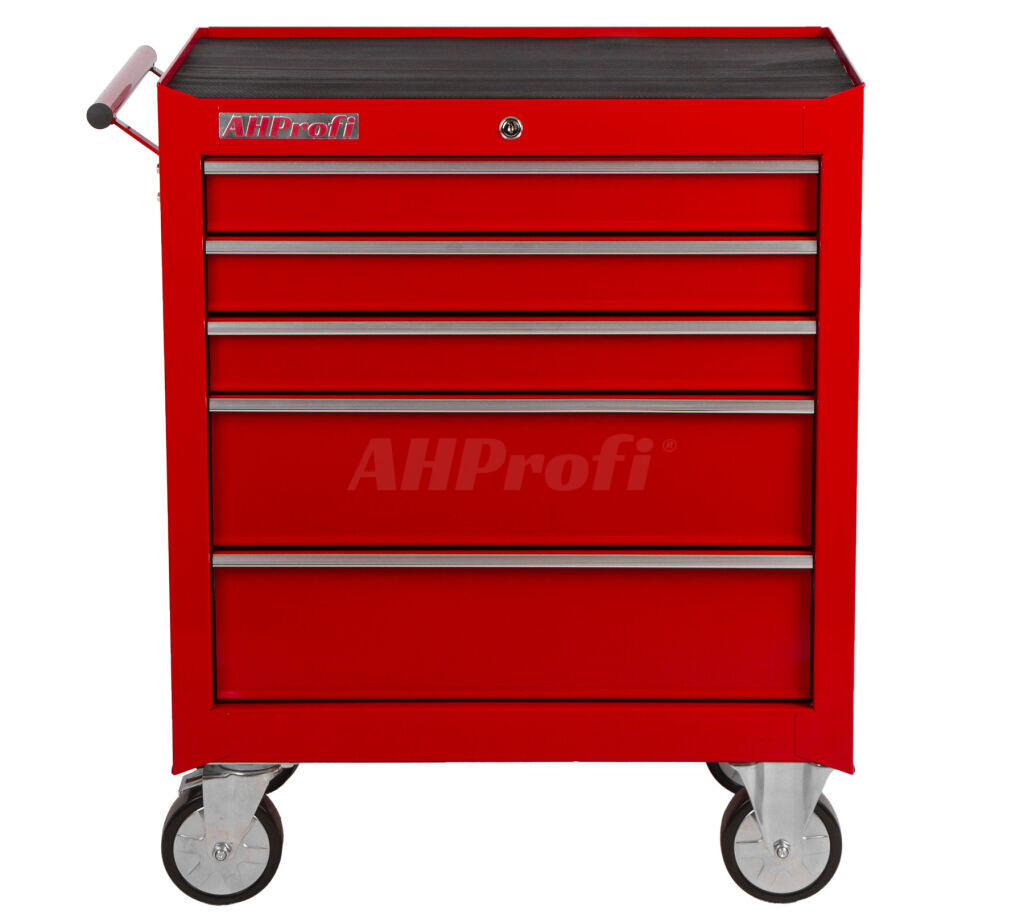 Profesionálna montážna pojazdná skriňa z oceľového plechu, 5 uzamykateľných zásuviek s guličkovými ložiskami, 4 kolieska, špeciálna odolná povrchová úprava.