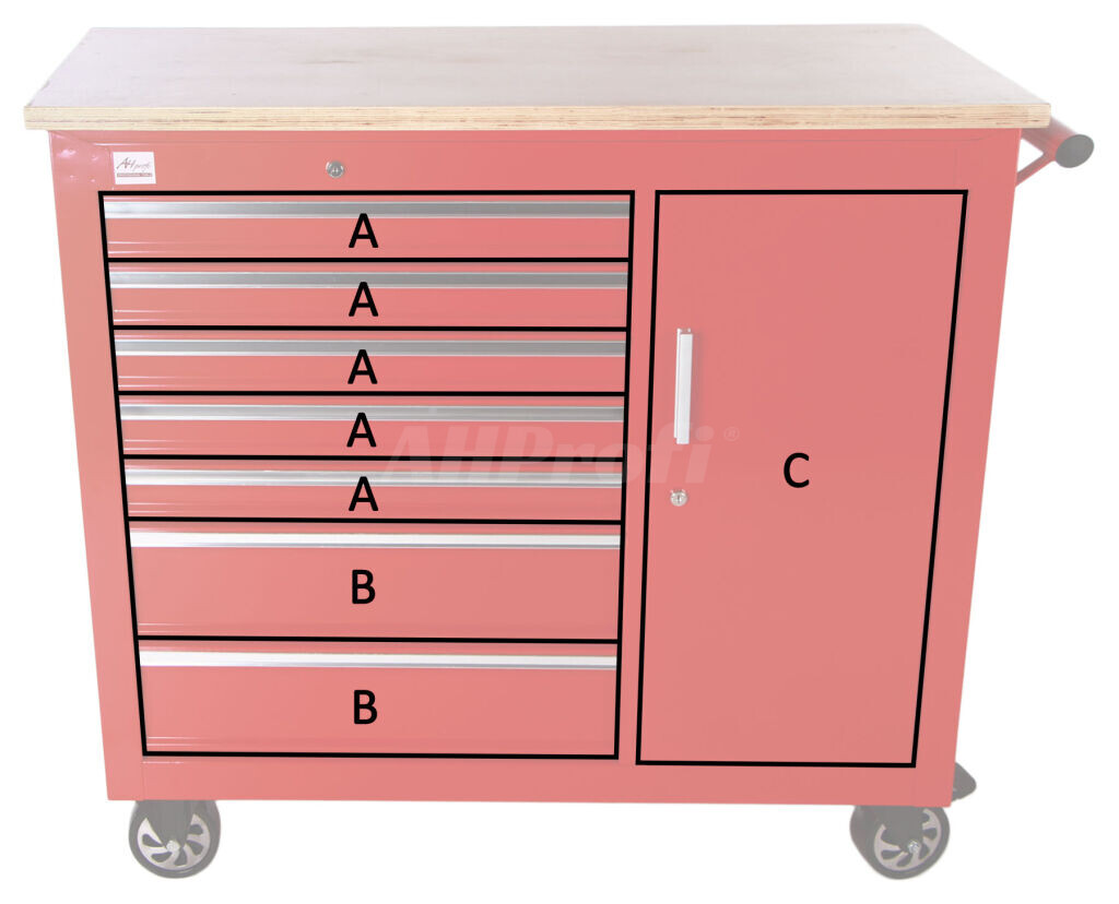 Vozík sa skládá zo 7 zásuviek, uzamykateľné skrinky a z masívnej drevenej pracovnej dosky