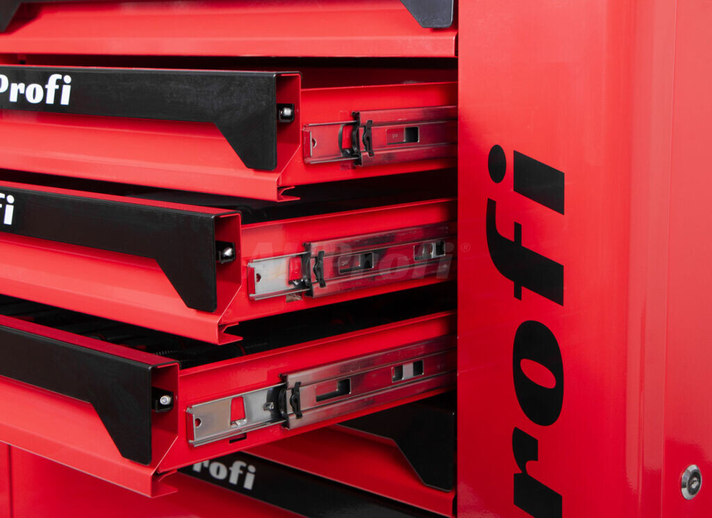 Vozík ponúka 7 zásuviek, z toho 5 zásuviek je osadených výplňami s PROFI náradím a 2 zásuvky ostávajú voľné pre doplnenie podľa potreby.