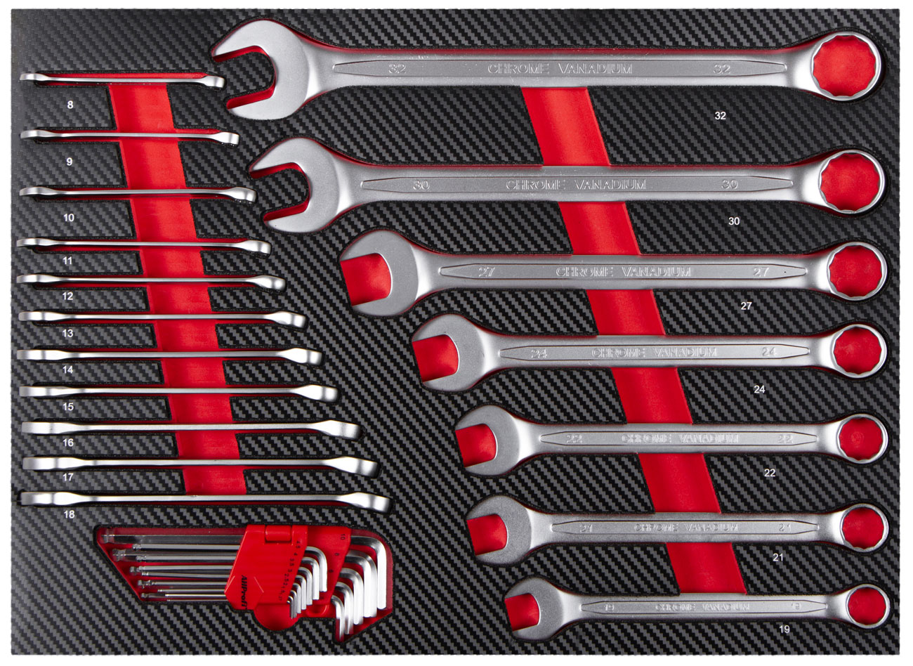 | 18 ks | Očkoploché kľúče: 8, 9, 10, 11, 12, 13, 14, 15, 16, 17, 18, 19, 21, 22, 24, 27, 30, 32 mm |