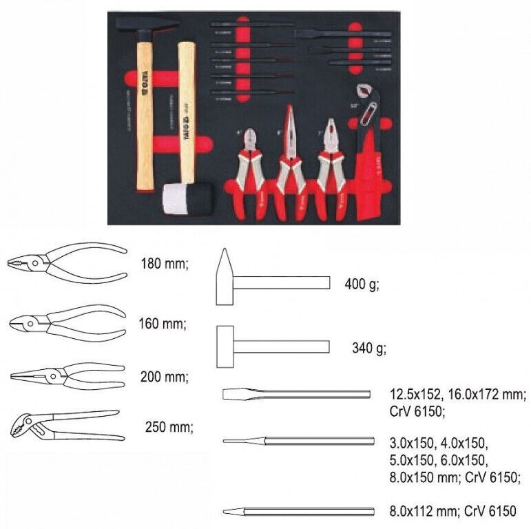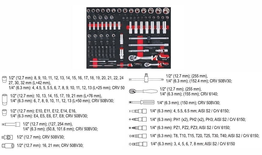 | Vozík obsahuje: | Závitníky, Kombinované kliešte, Siko kliešte, Kladivo / palička, Predlžovacie nástavce, Kardanový kĺb, Drôtená kefa, Sekáče, Imbus, Magnetický vyťahovák, Pilníky, Nastaviteľný kľúč, Dlhé nástrčné kľúče, Meter, Ploché skrutkovače, Gola sada, Uholník, Očkoploché kľúče, Vyrážače, Posuvné meradlo, Krížové skrutkovače, Štiepacie kliešte, Nástrčné kľúče, Torx, Bity |
