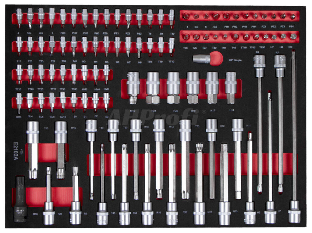 | 48 ks | Hlavice s bitmi (37 mm): Krížové: PH0, PH1, PH2, PH3, PZ0, PZ1, PZ2, PZ3 Ploché: 4, 5.5, 6.5, 7 mm Torx: T8, T9, T10, T15, T20, T25, T27, T30, T40, TT8, TT9, TT10, TT15, TT20, TT25, TT27, TT30, TT40, TS10, TS15, TS20, TS25, TS27, TS30, TS40, TS45, TS50 Imbus: H3, H4, H5, H6, H7, H8 Tisícihran: M8, M10, M12 |