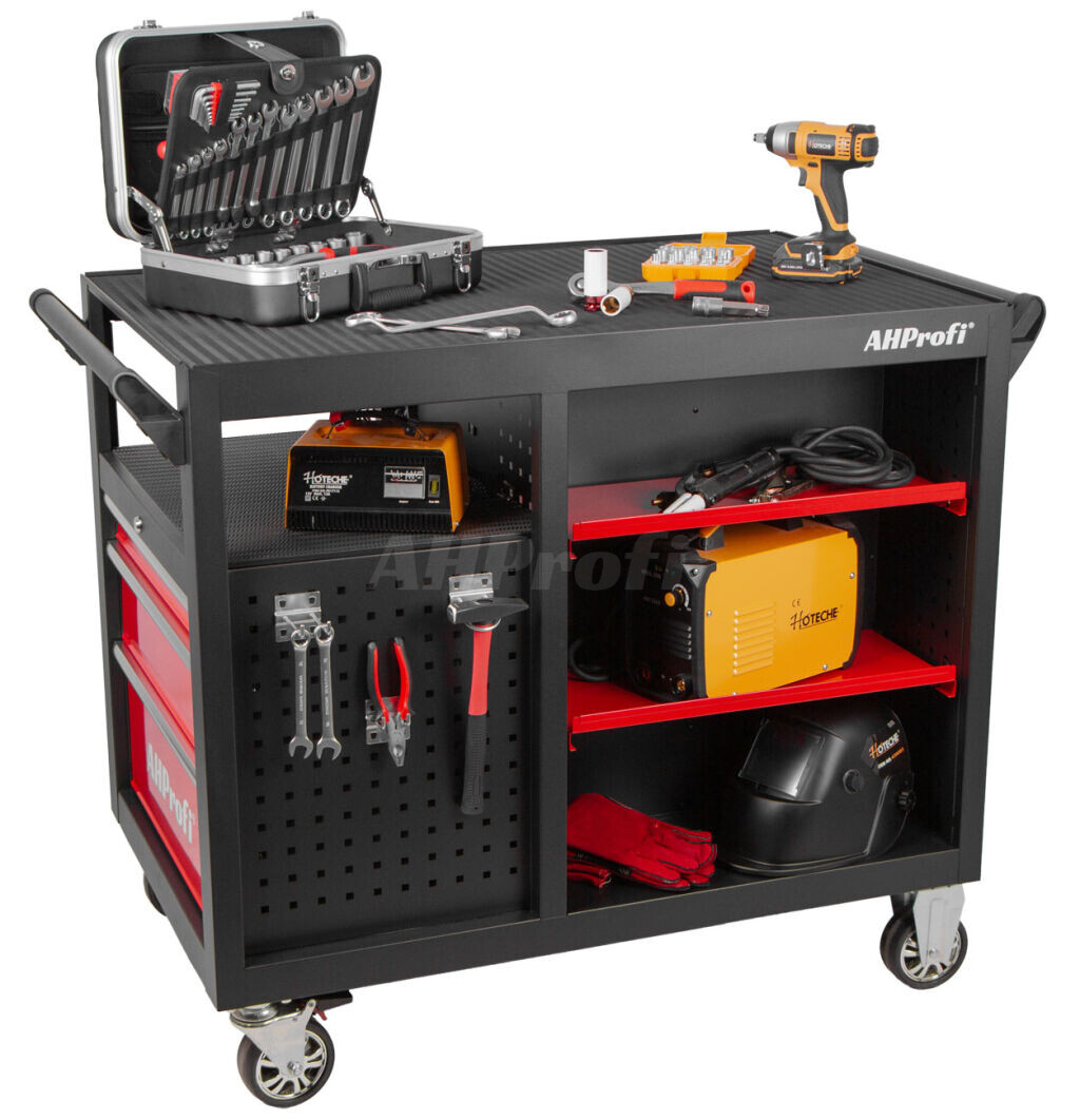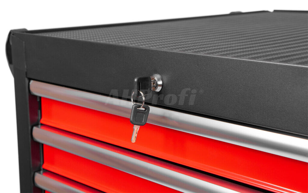 Kovová 360 ° konštrukcia, výplne s náradím, pracovná plocha s gumovou podložkou, elektrická zásuvka, 10 uzamykateľných zásuviek.