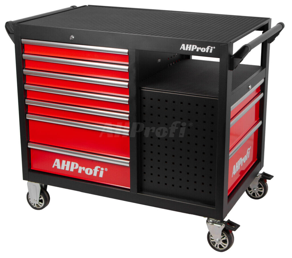 Široká konštrukcia vozíka s množstvom úložného priestoru s celkovo 10 zásuvkami a policami na náradie. S celkovými rozmermi (š x h x v) 1123 mm x 730 mm x 844 mm (bez koliesok), ponúka vozík dostatočný úložný priestor aj pre náročných používateľov.