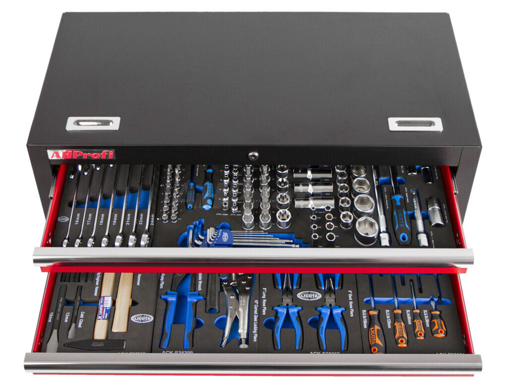Horné dva šuplíky obsahujú výplne s najpoužívanejším náradím. Náradie je uložené v penových výplniach, v ktorých skvele drží, na rozdiel od plastovej výplne.