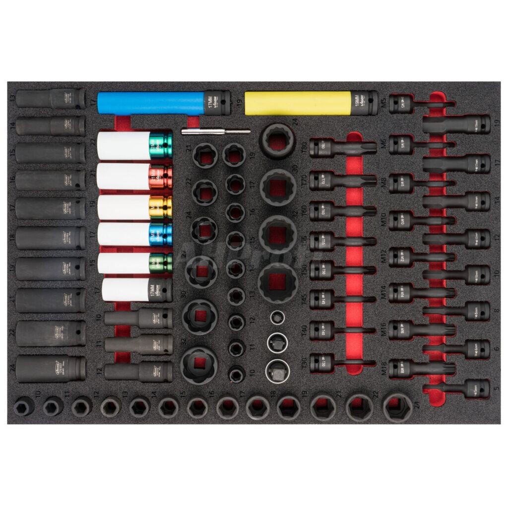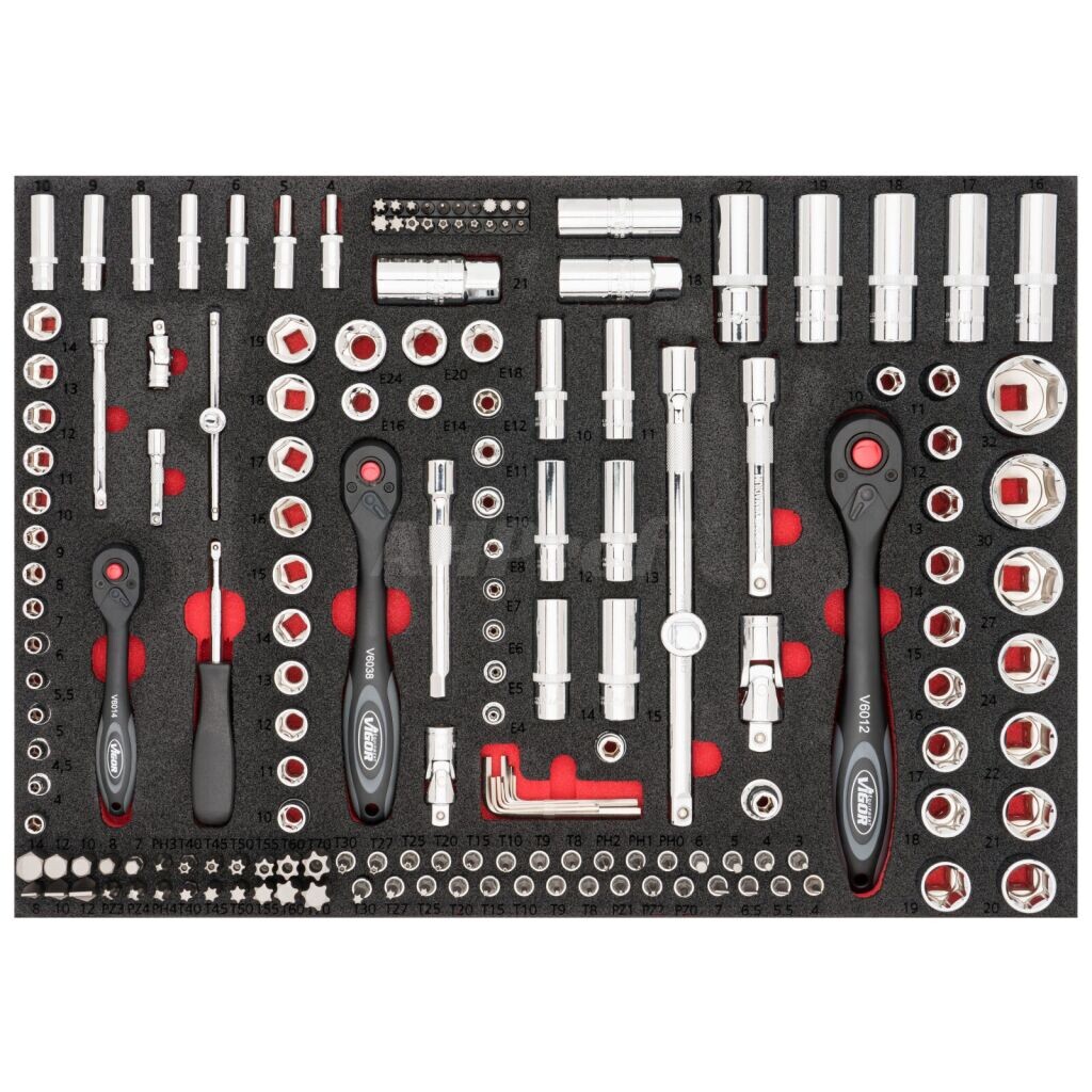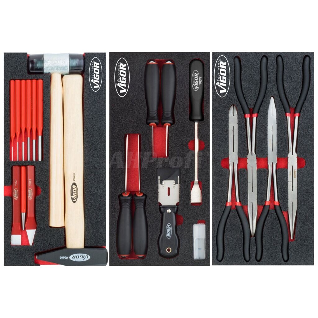 V zásuvkách sú penové výplne dielenských vozíkov s bežne používaným náradím v profesionálnej kvalite. V sadách náradia nájdete golu 1/4", 1/2", 3/8", nástrčné kľúče, sadu klieští, kladivo a paličku, veľkú sadu skrutkovačov (klasické, elektrikárske aj hodinárske), IMBUSY, veľkú sadu kľúčov a mnoho ďalšieho.