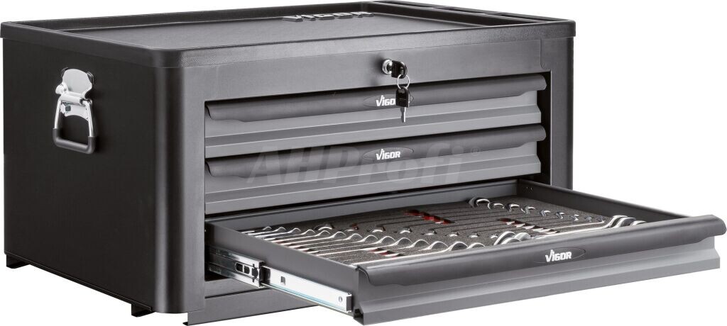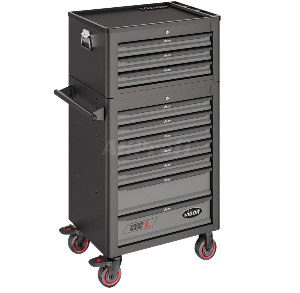 Profesionálny dielenský vozík od nemeckej značky VIGOR,vybavený celkom 344 kusmi náradia v penových vložkách, 10 zásuviek.