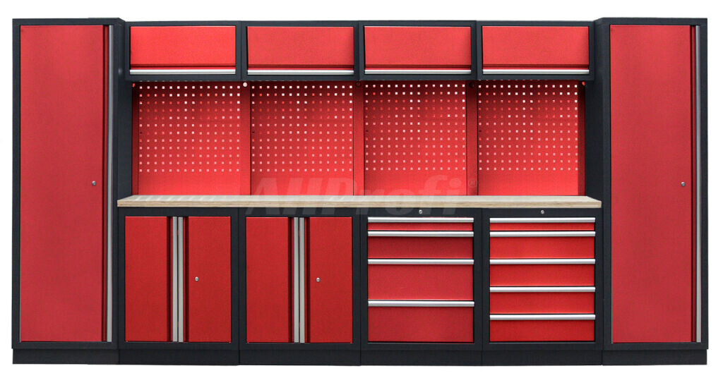Dielenský nábytok PROFI RED s drevenou doskou zaujme moderným a profesionálnym vzhľadom. Kombinácia červenej RAL 3031 a čiernej RAL 9004 sa bude vynímať v každej garáži aj dielni.