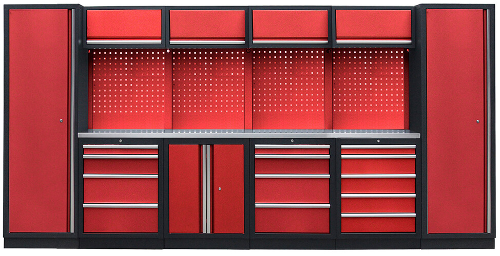 Zostava 21 ks, 3920 x 495 x 2000 mm, nerezová pracovná doska, modulárna, celokovová, červená. Horné skrinky: 4 výklopné. Spodné skrinky: dvojkrídlové / 2x 4 a 5 šuplíková. Vysoké skrine: 2 úzke. 4 dierované dosky s rozstupom 38 x 38 mm. Kvalitný dielenský nábytok vhodný pre profesionálne servisy aj domáce garáže a dielne.