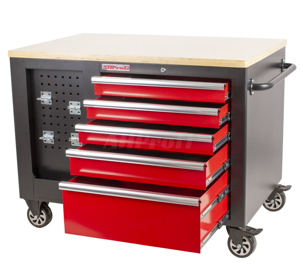 Čierno-červený veľký dielenský vozík s 10-timi zásuvkami s rozmermi (š x h x v): 1141 x 730 x 888 mm. Vozík je uzamykateľný, má 2 pevné a 2 otočné pogumované kolieska a je doslova všestranný. Uskladňovacie priestory má zo všetkých strán!