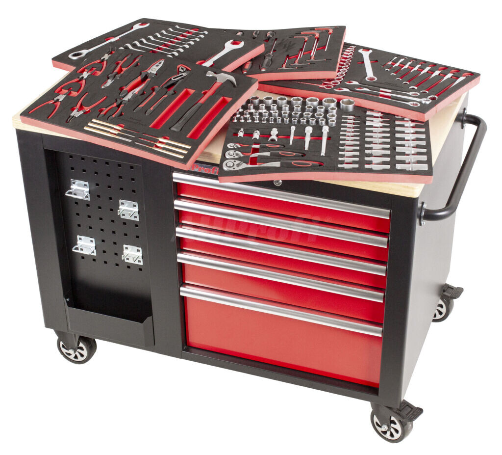 Veľký vybavený dielenský vozík využiteľný zo všetkých strán. 10 zásuviek. 2x dierované dosky s priehradkou. Držadlo a kolieska pre ľahkú manipuláciu. 138 ks náradia v penových výplniach.