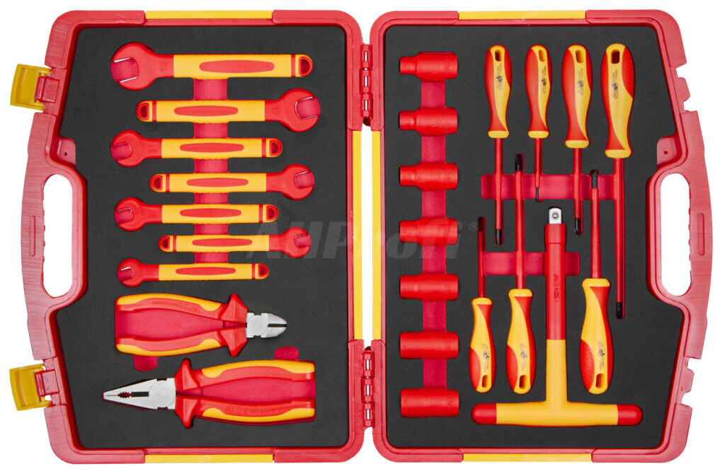 Izolované náradie v plastovom kufri, sada 24 ks v penovej výplni. 7 plochých kľúčov, 7 nástrčných hlavíc, 7 skrutkovačov. Kombinované a bočné štiepacie kliešte, T-nadstavec 1/2". Izolácia podľa normy EN/IEC 60900 do 1000 V AC.