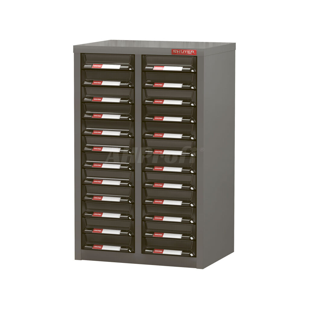 Zakladač montážneho materiálu s 24 priehľadnými plastovými zásuvkami. Rozmery skrinky: 362x571x265 mm (Š x H x V) a šuflíky 150x248x40 mm.