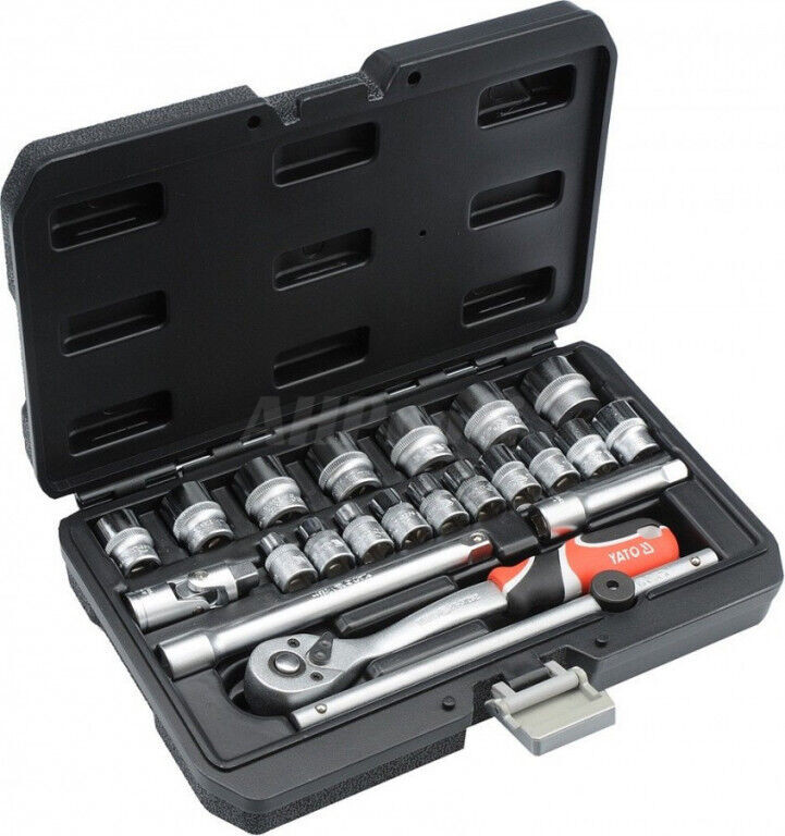 Sada nástrčných kľúčov YATO, 22 kusov v plastovom kufríku, obsahuje orechy 3/8 "6-22 mm, račňu, nadstavce, T vratidlo a kardanový kĺb.