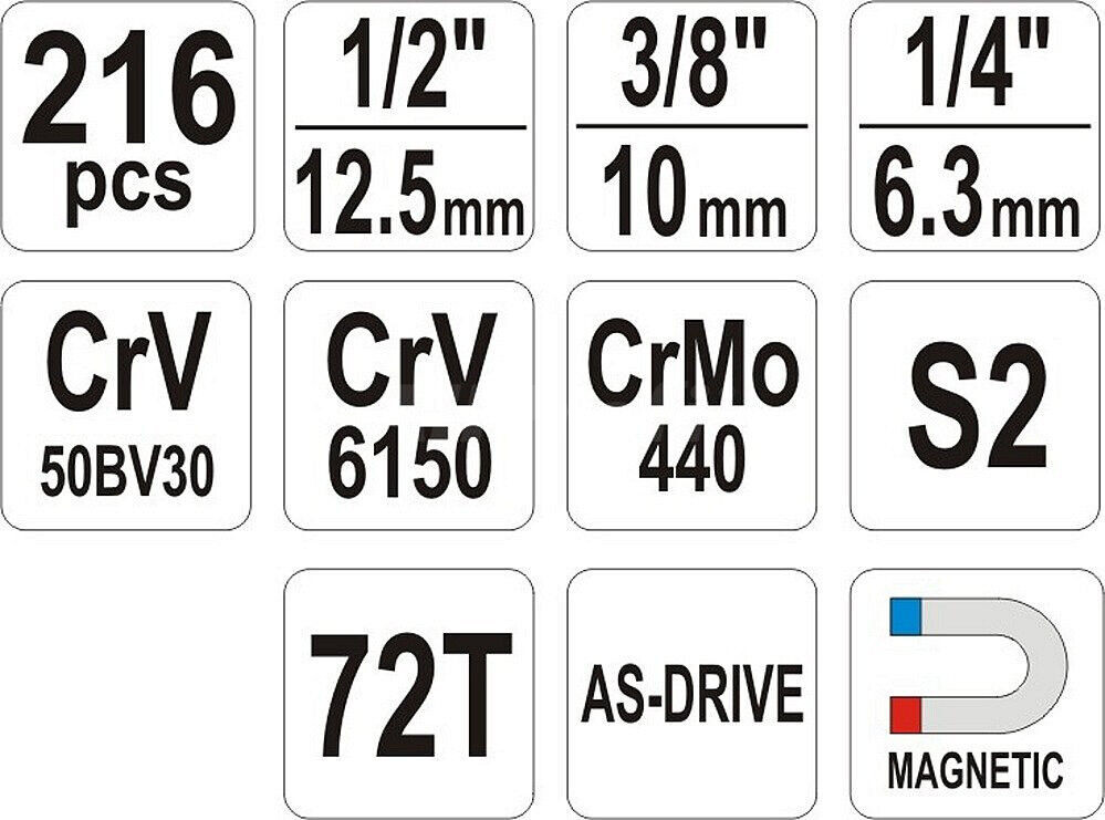 Sada náradia obsahuje 216ks príslušenstva: okrem iného Gola sada 1/2 ", 3/8", 1/4 ", nadstavce, predlžovacie nástavce, račne s plastovou rukoväťou, kĺbové nadstavce očkoploché kľúče a ďalšie príslušenstvo. Vyrobené z kvalitnej chrómvanádiovej ocele CrV 6140 a CrV 50BV30, S2 s funkciou AS-DRIVE.