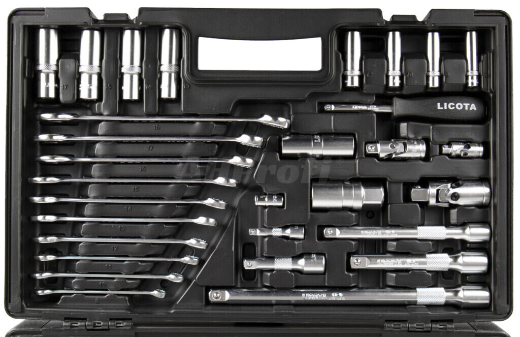 Profesionálna gola sada LICOTA, 120 kusov v plastovom kufri, obsahuje nástrčné kľúče 1/4 ", 3/8" a 1/2 ", račne, kĺbové a predlžovacie adaptéry, nadstavce na žhaviace sviečky, bity, ..
