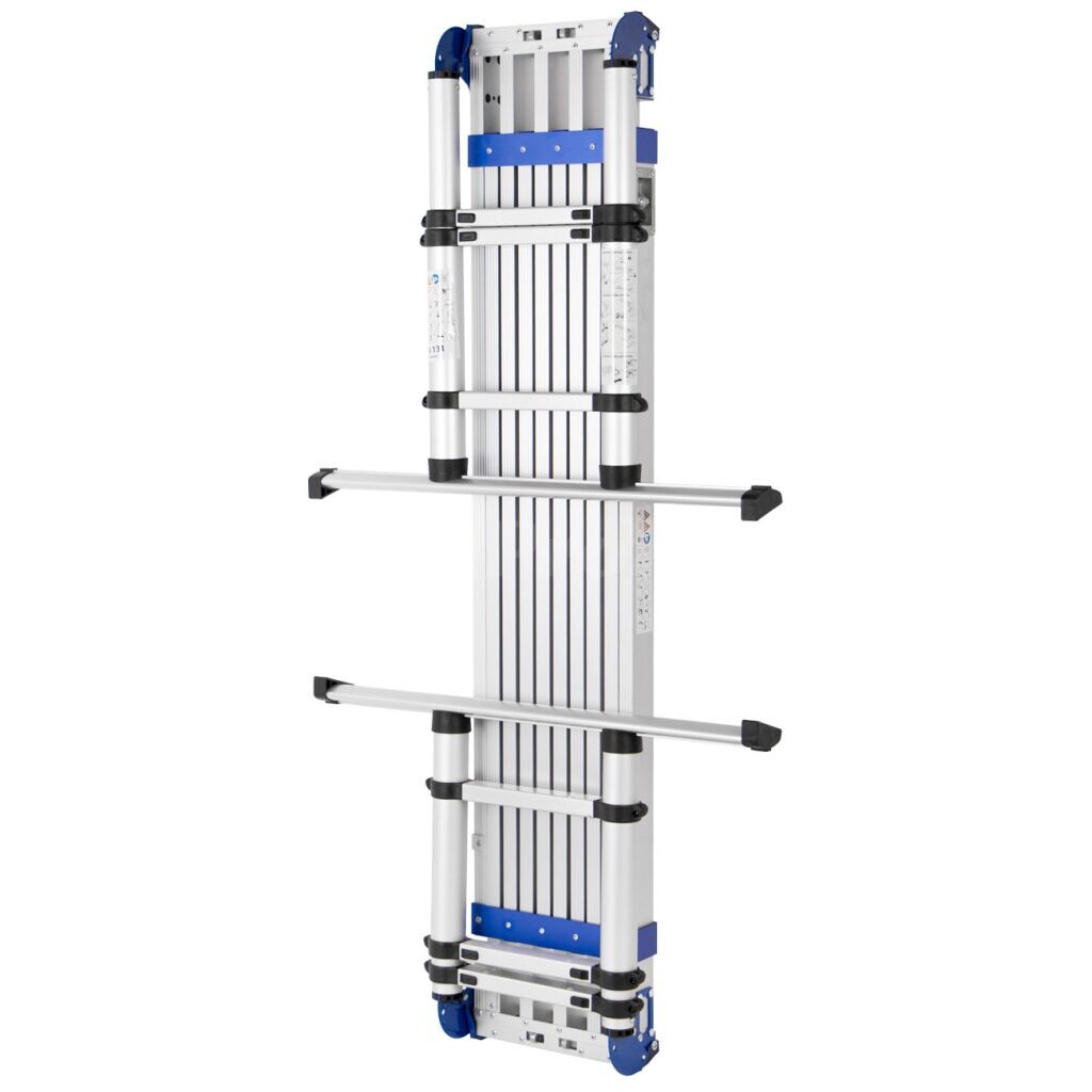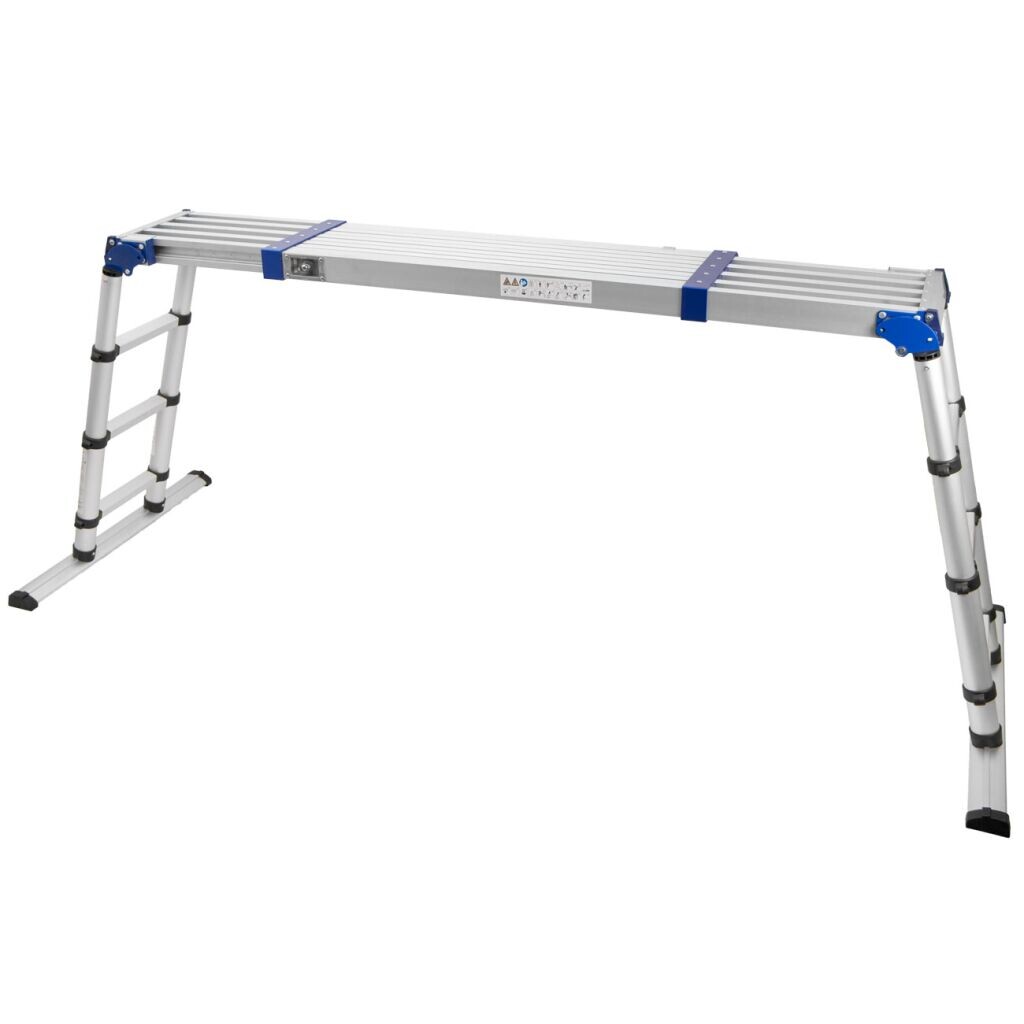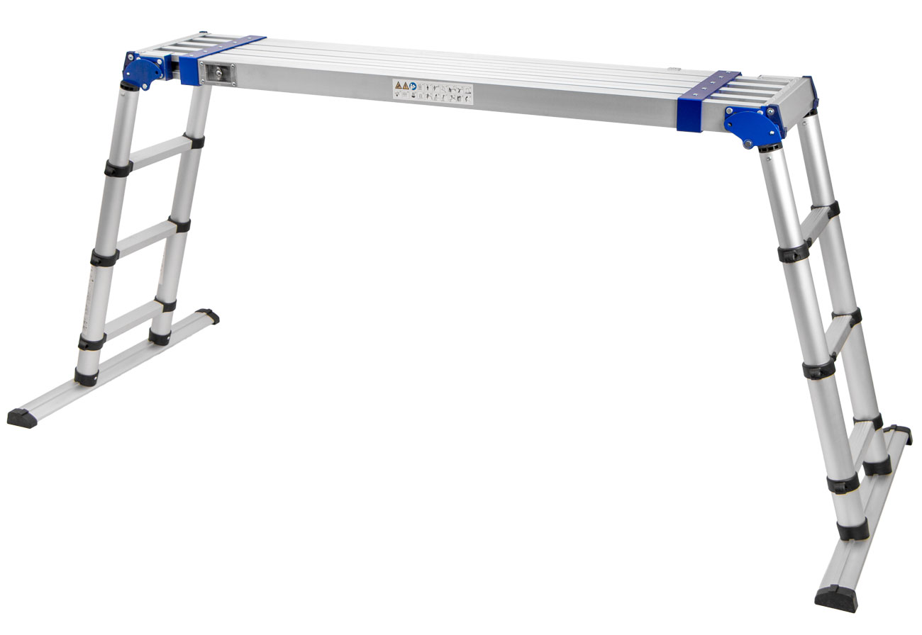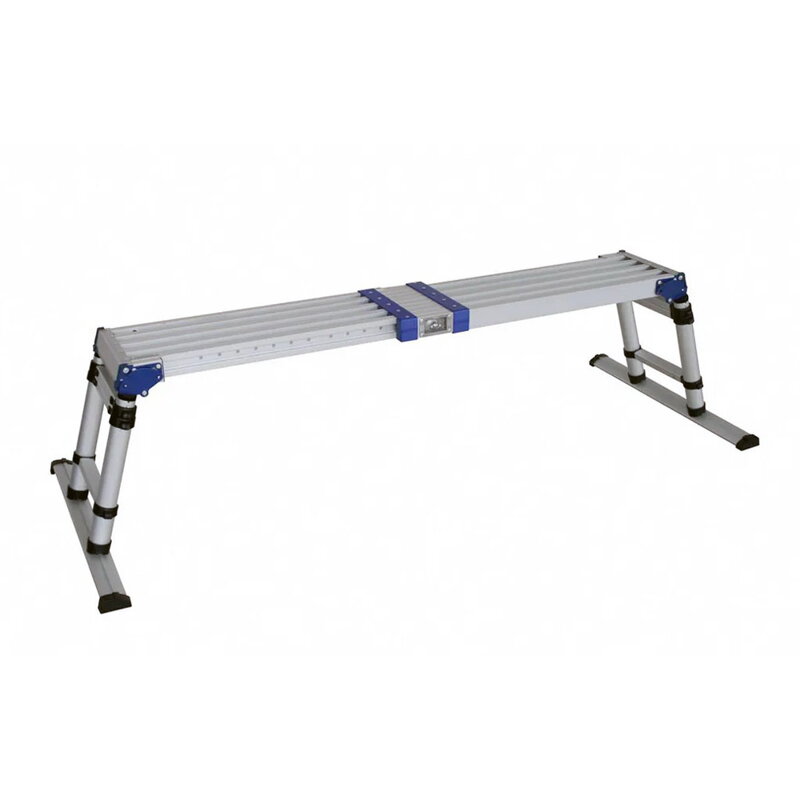 Teleskopická pracovná plošina, dĺžka 152-261 cm, 3 výškové stupne 530/730/930 mm, nosnosť 150 kg. Hliníková konštrukcia. Spĺňa normu EN 131. Hmotnosť 15,5, kg.