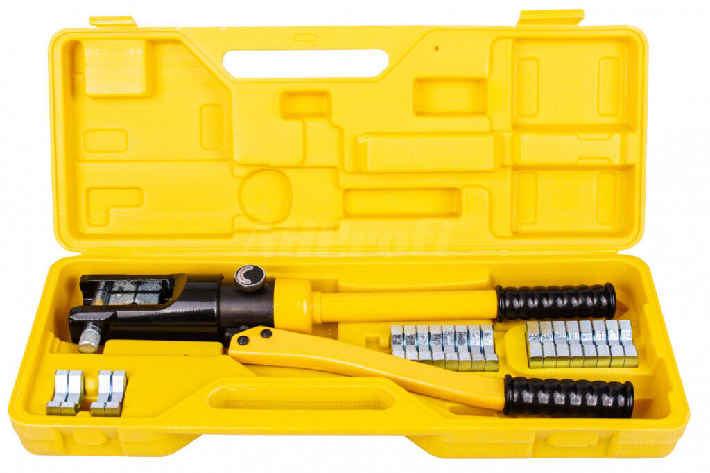 Lisovacie kliešte na koncovky káblov s hydraulickým posilovačom s maximálnym tlakom 8 ton. Ku kliešťom sú v balení lisovacie koncovky pre medené vodiče o rozmeroch 10 - 120 mm2 a pre hliníkové drôty s rozmermi 10 - 95 mm2. Sila tlaku čeľustí je regulovateľná a vďaka prevodu hydraulickej sily je lisovanie koncoviek veľmi jednoduché. Kliešte s koncovkami sú v plastovom boxe. Hydraulické lisovacie kliešte vážia 2,8 kg a sú 415 mm dlhé.