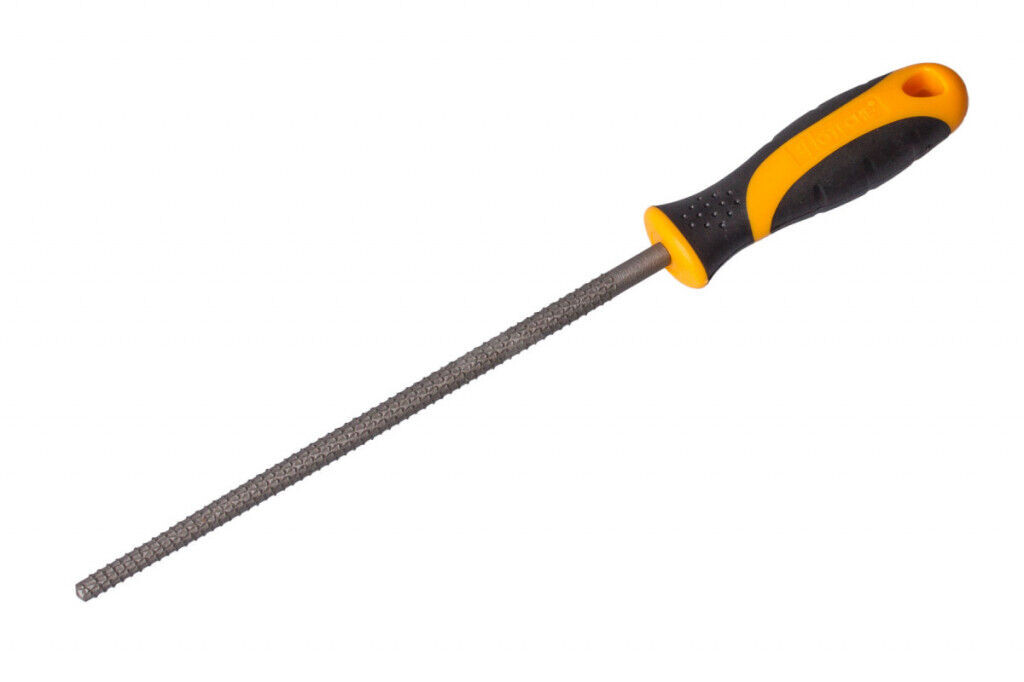 Okrúhly pilník na drevo, ergonomická rukoväť, materiál: plast, Cr-V, 120 g. Dĺžka pilníka 200 mm.