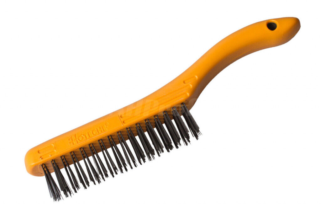 Zahnutá drôtená kefa vyrobená značkou Hoteche je vhodná na odstránenie hrubých nečistôt z kovov a iných odolných materiálov. Ručná kefa je osadená radom oceľových štetín. Kefu odporúčame využívať aj na ťažko prístupných miestach.