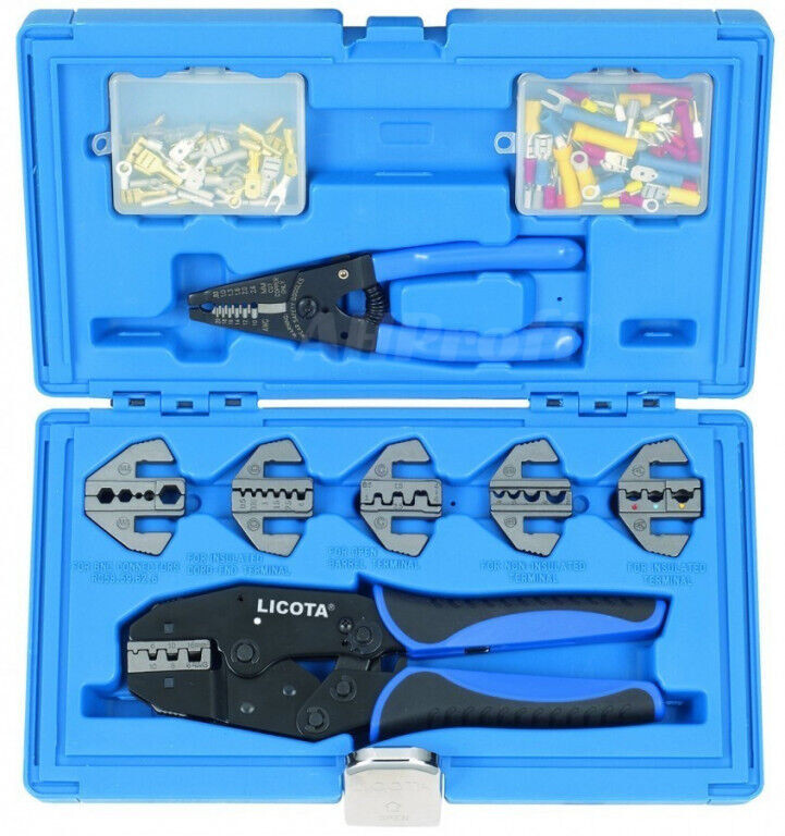 Sada krimpovacích klieští a vymeniteľných nástavcov. 2 ks klieští, 6 ks čeľustí a 130 koncoviek.