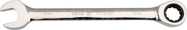 Račňový očkoplochý kľúč YATO 15 mm je na jednej strane klasický vidlicový kľúč, na strane druhej prstencový kľúč s dvanáctihranným profilom vybaveným račňou s jemným delením 72 zubov. Telo kľúča je vyrobené z chrómovanej ocele CrV6140. Povrch je vyleštený do vysokého lesku.