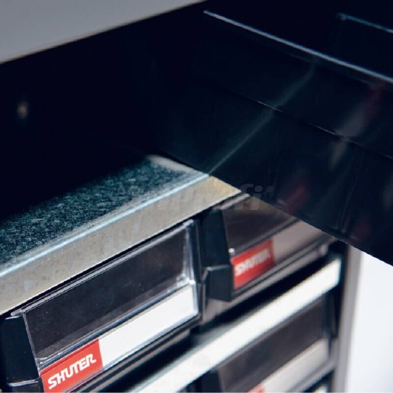 - Zásuvky sú opatrené priehľadným čelom a madlami s popisovacím štítkom pre presnú identifikáciu uloženého materiálu.