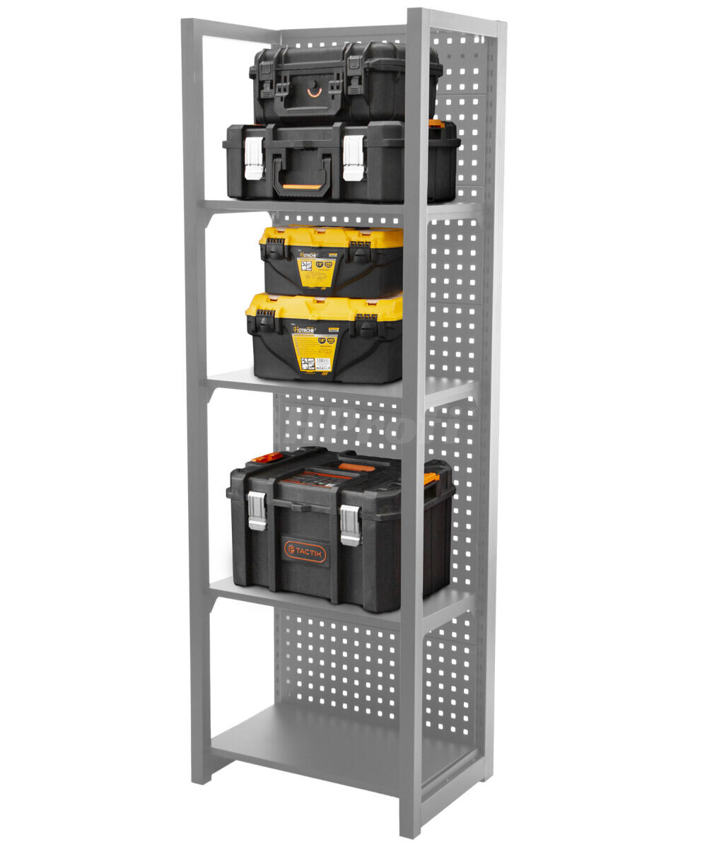 Stabilitu regálu zaisťujú dve bočnice a zadná dierovaná doska, ktorú je možné tiež využiť pre zavesenie drobného náraia pomocou háčikov (náradie a háčiky niesú súčasťou balenia).