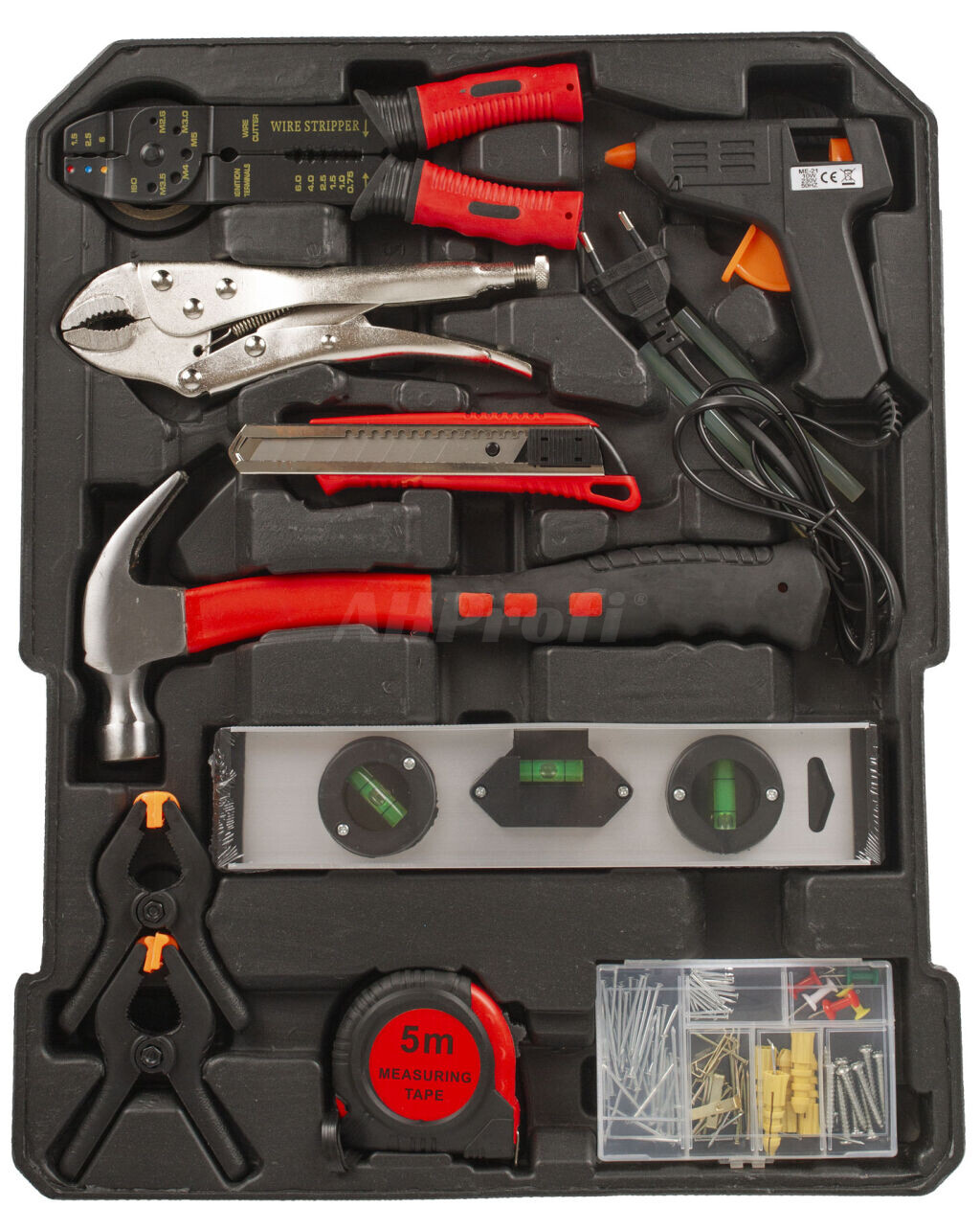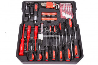 - Sada obsahuje celý rad klieští, skrutkovačov, gola kľúčov, kladivo, vodováhu, stranové aj imbus kľúče, bity, základný spojovací materiál a ďalšie náradie, ktoré je vhodné pre použitie ako doma, v garáži, tak aj na cestách.