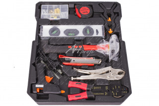 | Sada obsahuje: | Golu, Vodováhu, Kladivo / palicu, Nôž, Spojovací materiál, Elektrikárske skrutkovače, Stolarske svorky, Kardanový kĺb, Nástrčné kľúče, Račňové kľúče, Tavnú pištoľ, Hodinárske skrutkovače, Meter, Predlžovacie nástavce, Hlavica s bity, Skúšačku, Kliešte, Odizolovacie kliešte, Skrutkovače |