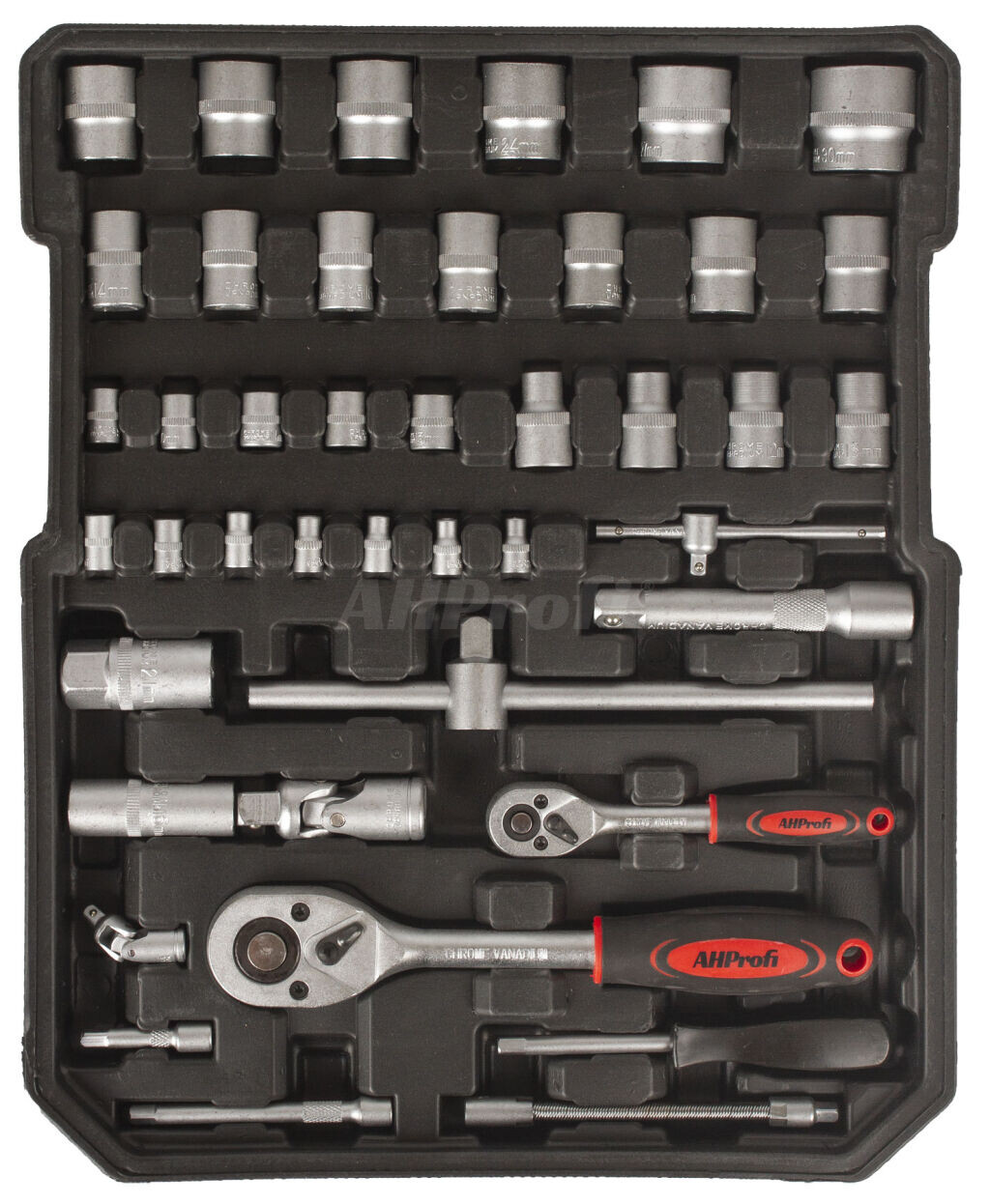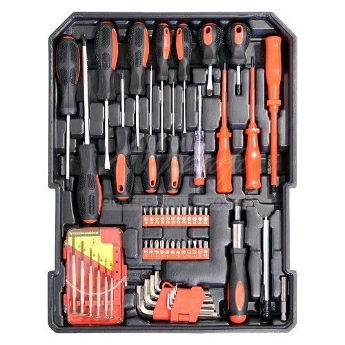 - Sada obsahuje: celú radu klieští, skrutkovačov, gola kľúčov, kladivo, vodováhu, stranové aj imbus kľúče, bity, základný spojovací materiál a ďalšie náradie, ktoré je vhodné na použitie doma, v garáži aj na cestách.