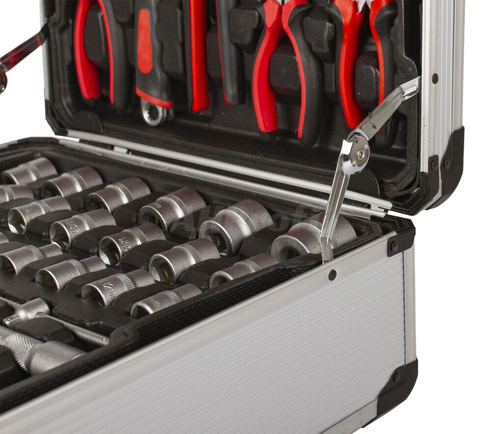 Praktický hliníkový kufor so 186 dielmi kvalitného ručného náradia. Prvky z kovu sú z Cr-V v matnom prevedení. Madlá a rukoväte tvorené kombináciou gumy a plastu veľmi dobre padnú do ruky a zaručujú pohodlný úchop. Výbava je vhodná do každej dielne a domácnosti.