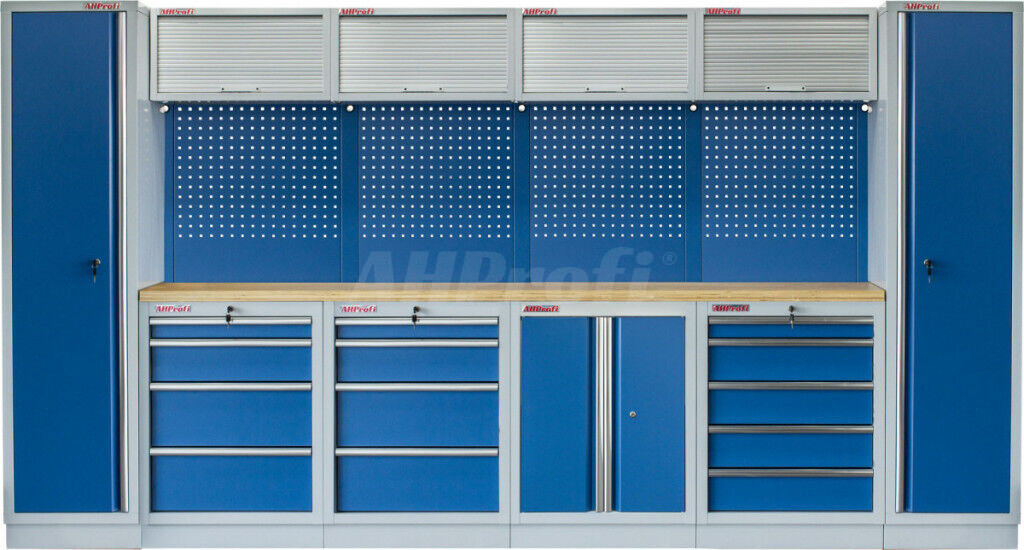Zostava 21 ks, 3920 x 495 x 2000 mm, drevená pracovná doska, modulárna, celokovová, modrá. Horné skrinky: 4 s roletou. Spodné skrinky: dvojkrídlové / 2x 4 a 5 šuplíková. Vysoké skrine: 2 úzke. 4 dierované dosky s roztečí 38 x 38 mm. Kvalitný dielenský nábytok vhodný pre profesionálne servisy aj domáce garáže a dielne.