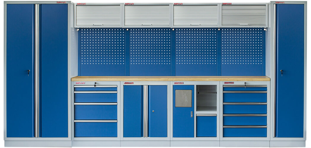 Zostava 21 ks, 4235 x 495 x 2000 mm, drevená pracovná doska, modulárna, celokovová, modrá. Horné skrinky: 4 s roletou. Spodné skrinky: dvojkrídlové / s košom / 4 a 5 šuplíková. Vysoké skrine: široké, úzke. 4 dierované dosky s rozstupom 38 x 38 mm. Kvalitný dielenský nábytok vhodný pre profesionálne servisy aj domáce garáže a dielne.
