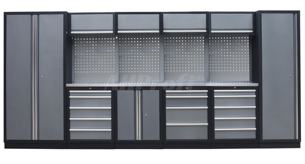 Zostava 21 ks, 4235 x 495 x 2000 mm, nerezová pracovná doska, modulárna, celokovová, šedá. Horné skrinky: 4 výklopné. Spodné skrinky: dvojkrídlové / 4 a 2x 5 šuplíková. Vysoké skrine: široké, úzke. 4 dierované dosky s rozstupom 38 x 38 mm. Kvalitný dielenský nábytok vhodný pre profesionálne servisy aj domáce garáže a dielne.