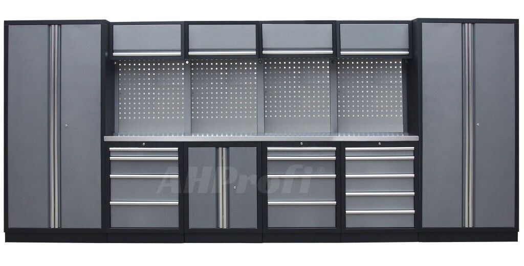 Zostava 21 ks, 4535 x 495 x 2000 mm, nerezová pracovná doska, modulárna, celokovová, šedá. Horné skrinky: 4 výklopné. Spodné skrinky: dvojkrídlové / 2x 4 a 5 šuplíková. Vysoké skrine: 2 široké. 4 dierované dosky s rozstupom 38 x 38 mm. Kvalitný dielenský nábytok vhodný pre profesionálne servisy aj domáce garáže a dielne.