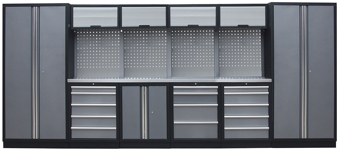 Zostava 21 ks, 4535 x 495 x 2000 mm, nerezová pracovná doska, modulárna, celokovová, šedá. Horné skrinky: 4 s roletou. Spodné skrinky: dvojkrídlové / 4 a 2x 5 šuplíková. Vysoké skrine: 2 široké. 4 dierované dosky s rozstupom 38 x 38 mm. Kvalitný dielenský nábytok vhodný pre profesionálne servisy aj domáce garáže a dielne.