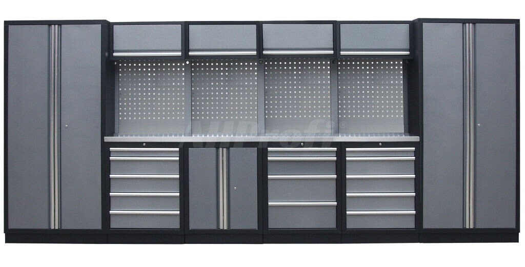 Zostava 21 ks, 4535 x 495 x 2000 mm, nerezová pracovná doska, modulárna, celokovová, šedá. Horné skrinky: 4 výklopné. Spodné skrinky: dvojkrídlové / 4 a 2x 5 šuplíková. Vysoké skrine: 2 široké. 4 dierované dosky s rozstupom 38 x 38 mm. Kvalitný dielenský nábytok vhodný pre profesionálne servisy aj domáce garáže a dielne.
