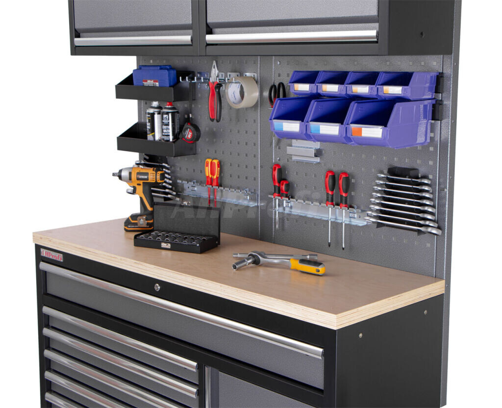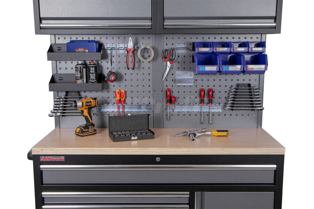 Perforovaná doska s roztečí dier 38 mm umožňuje efektívnu organizáciu náradia pomocou priloženého praktického príslušenstva.