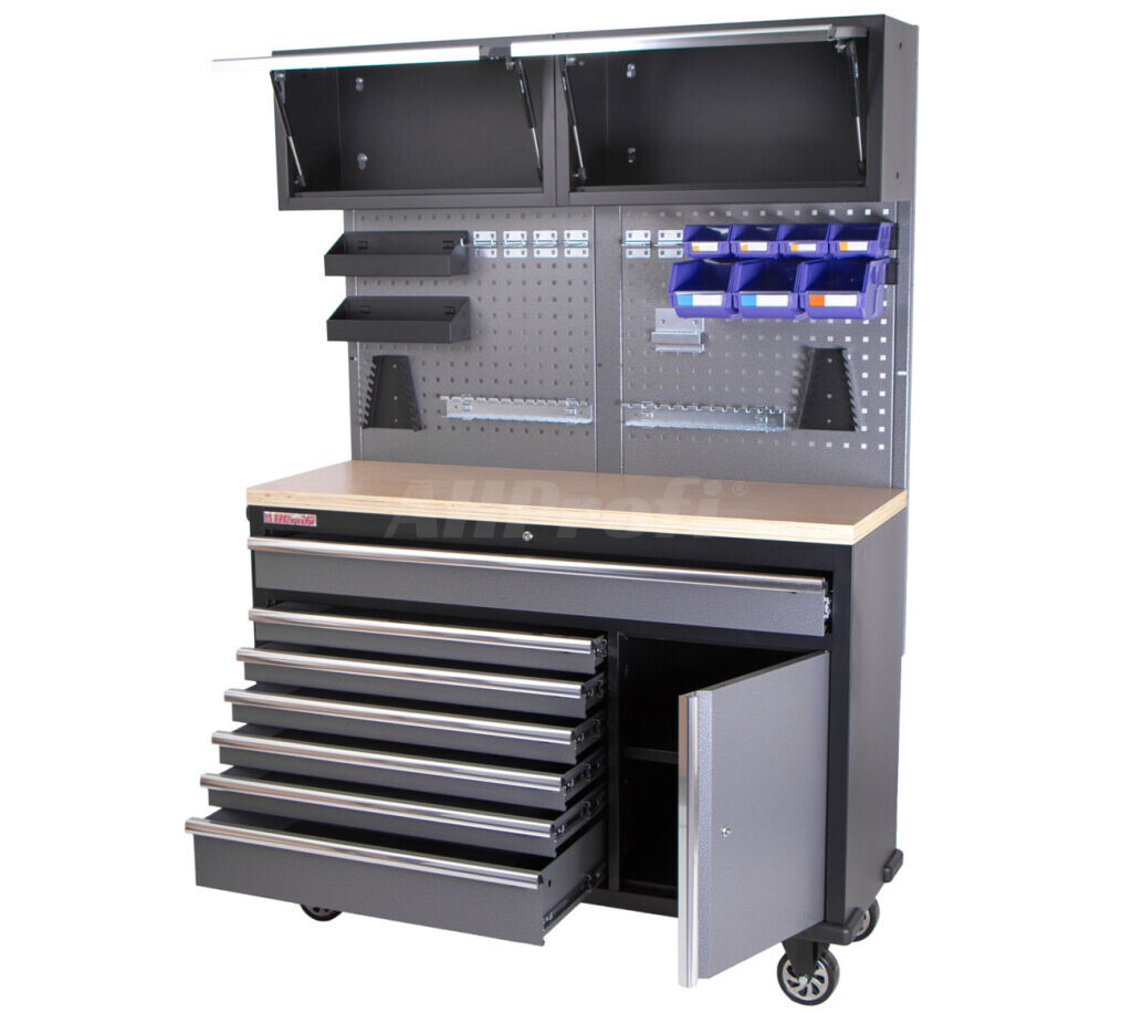 Pojazdný pracovný stôl PROFI s drevenou pracovnou doskou a hornými skrinkami, 7 zásuviek, rozteč perforovanej dosky 38 mm, rozmer pracovnej dosky 1360 x 465 x 35 mm, 4 pojazdové kolesá (2 otočné s brzdou). Pojazdy zásuviek s guličkovými ložiskami.