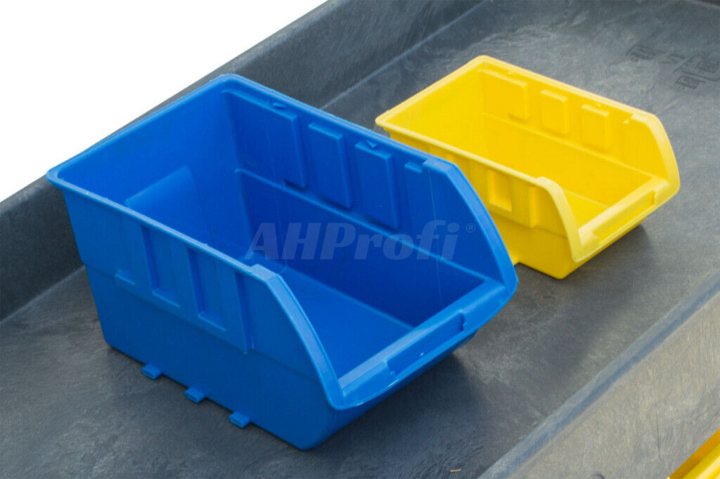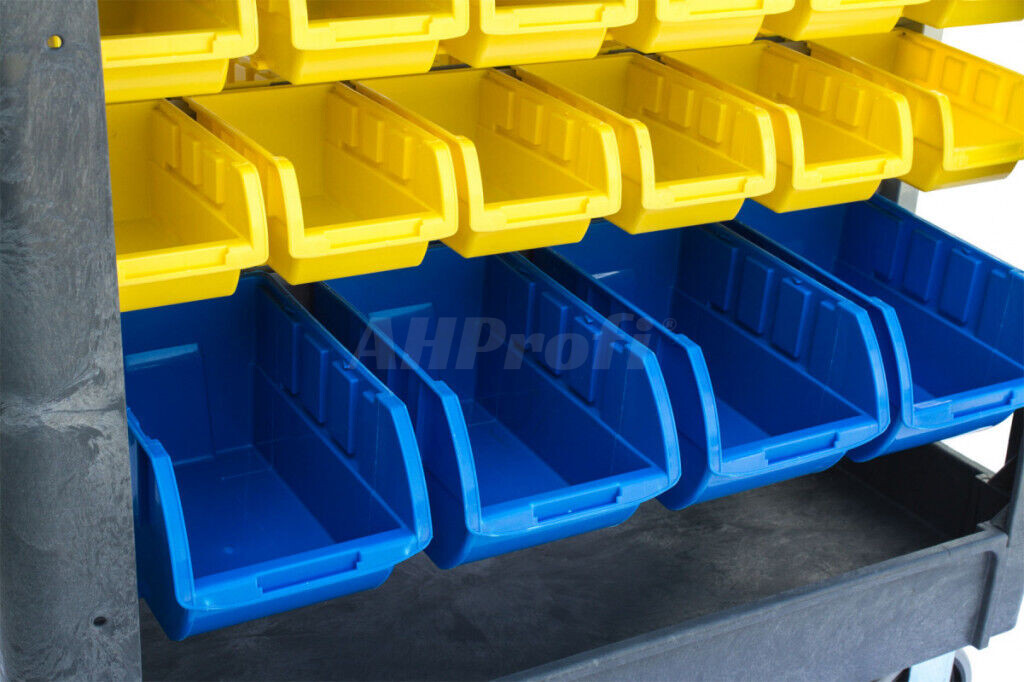 24 malých boxov 152x76mm, 8 veľkých boxov 203x127mm, rozmery vozíka 790x430mm, nosnosť 227kg, polypropylen.
