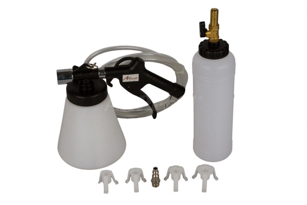 Sada na ľahké odvzdušnenie a výmenu brzdovej kvapaliny. Vákuová odsávačka, hydraulický systém. Dve 1l nádoby, odporúčaný tlak 5-8 bar. Použitie iba so vzduchovým kompresorom.